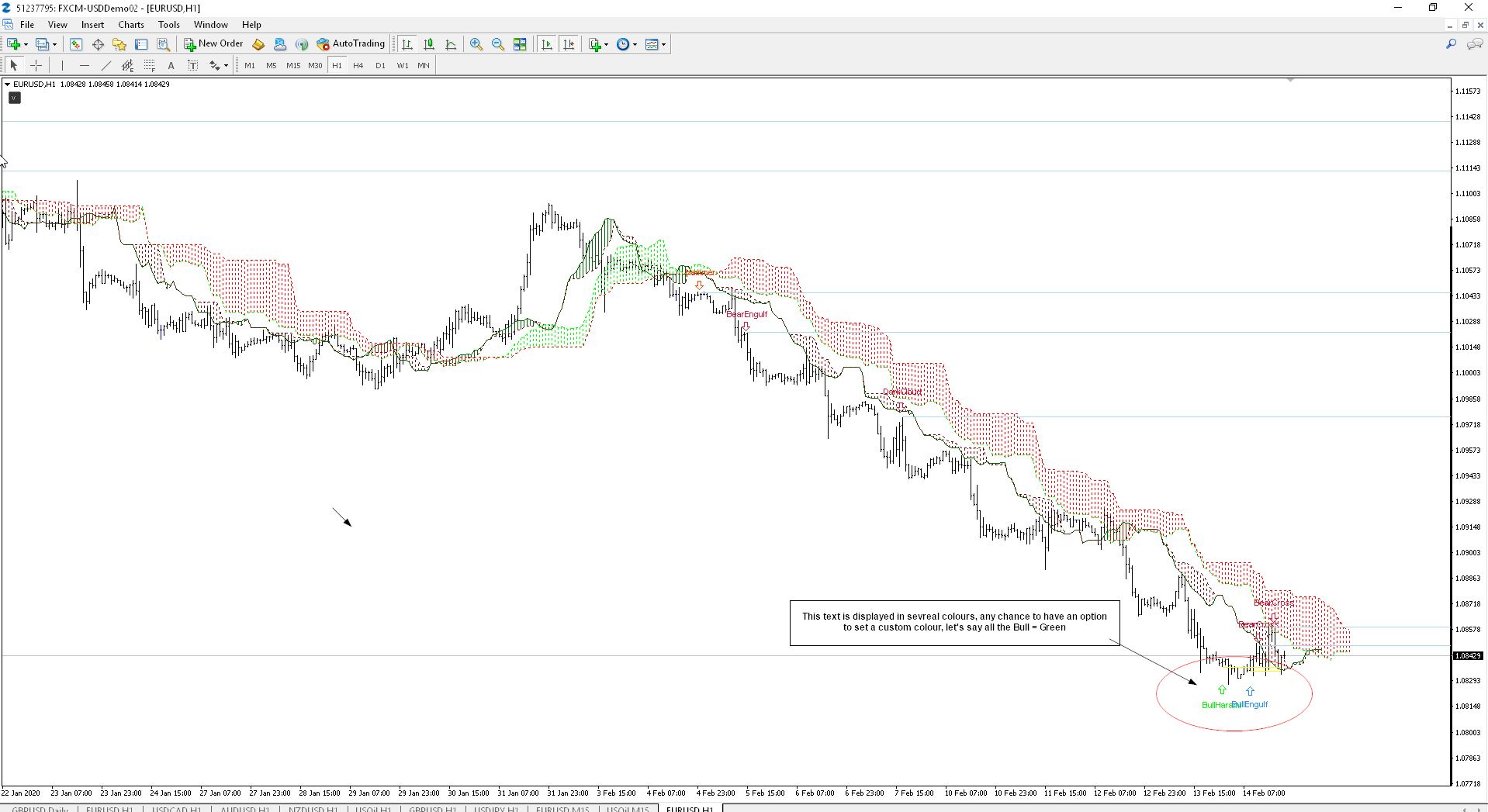 1) The indicator displays several colours for the different type of candlestick formations, is there a way to set an option to format the text colour to some other colour? (Please see attached chart.)