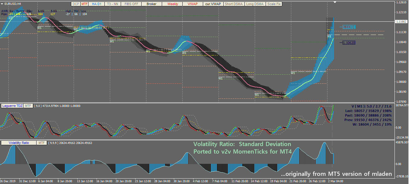 ─ Volatility Ratio: Now using a default Period value of 25 but it can change dynamically by getting the maximum value between the default Period of 25 vs the value of Dominant Cycle Period (DCP) divided by 3 (not divided in MTF & DCP mode is ON). The data is derived from the Standard Deviation of Price (close) and powered by MomenTicks