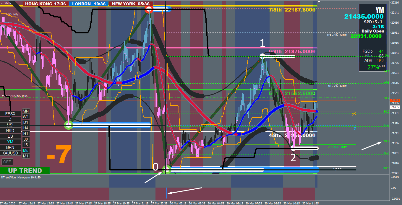 It can be seen from the picture that on the M5 timeframe all the favorable conditions for entering to buy were formed. The presence of a large green dot, indicating a possible end of the downward cycle, which is confirmed by the blue bar Extreme Spike indicator, we also see the rollback level satisfactory on the second wave - 76.4%. Let's pay attention to the double color change in the main window ... During the first wave, all indicators of the Xard's system changed color to blue, during the second correctional wave, again, everyone changed color to red. Further, we see that the price goes up from point 2. All Xard's indicators change color to blue, the histogram in the lower window also draws blue bars. All this in aggregate forms the conditions for entering the position up to M5 TF. Stop below the big green dot at 20800.