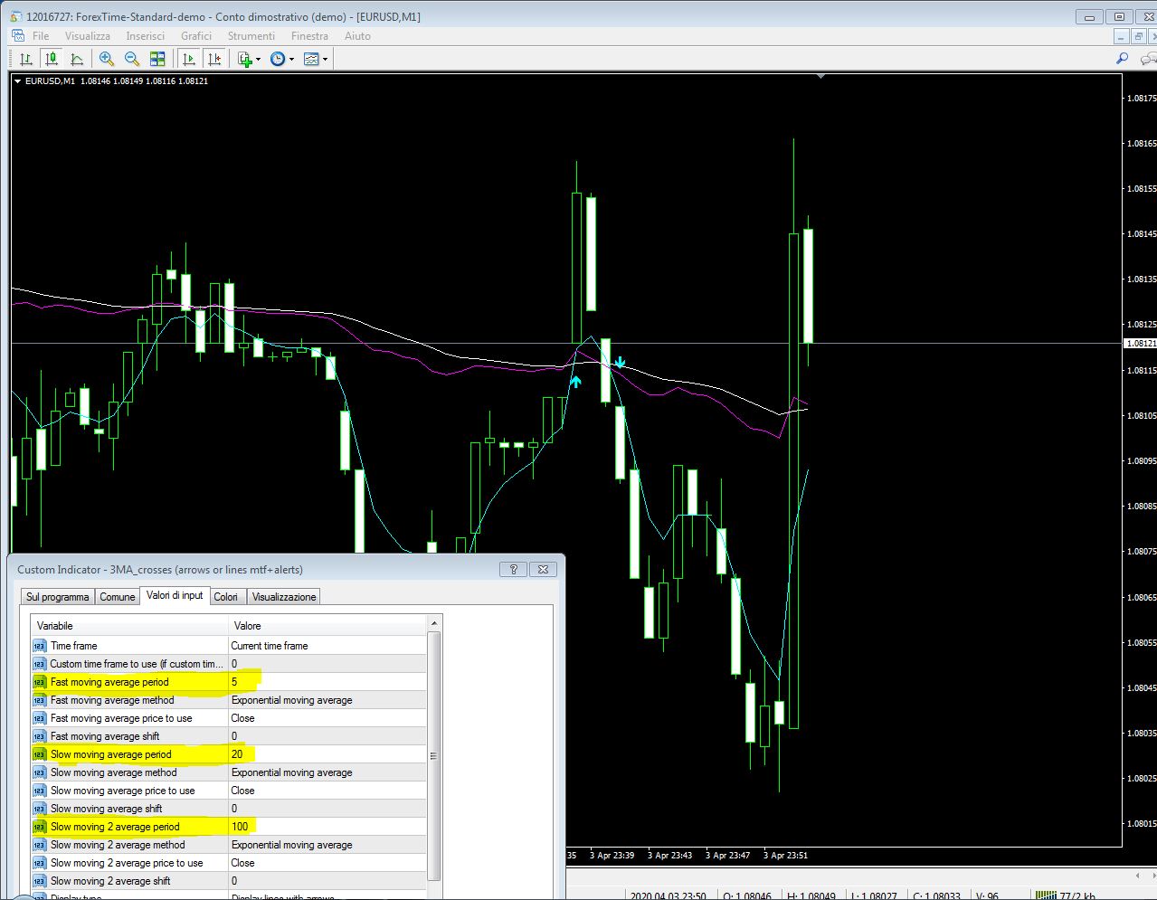 Scenario: You use the 5MA and 20MA crossover , with the 100MA as a filter. The indicator would trigger an arrow / alert for buy when 5MA>20MA>100MA is satisfied. If 5MA>20MA but 20MA<100MA the buy arrow / alert would not be triggered.