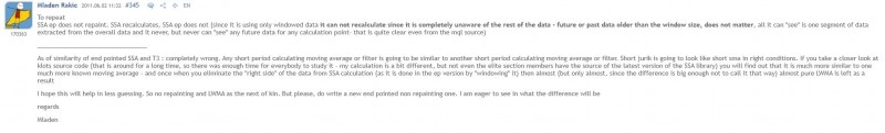 SSA ep does not repaint. SSA recalculates, SSA ep does not (since it is using only windowed data it can not recalculate since it is completely unaware of the rest of the data - future or past data older than the window size, does not matter, all it can "see" is one segment of data extracted from the overall data and it never, but never can "see" any future data for any calculation point- that is quite clear even from the mql source)..." The full post attached as an image for your consultation, also attached you can find the code (indicator) for the SSA ep coded by Mladen Rakic.