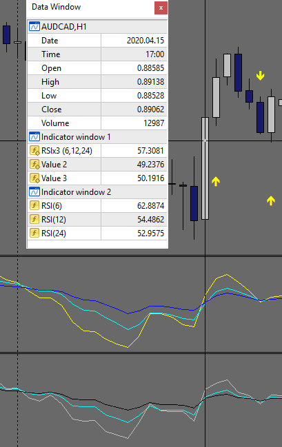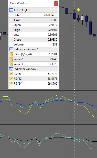 The second indicator readings are the same as MT4's RSIs, in the data window, but the arrow/Alert doesn't always appear. The first 6 pics I've attached were from the first indicator. The 7th is from indicator 2.