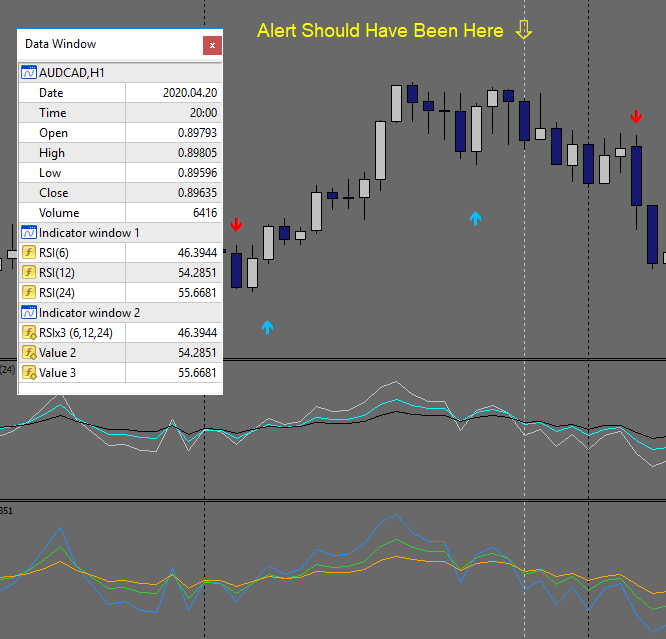 The second indicator readings are the same as MT4's RSIs, in the data window, but the arrow/Alert doesn't always appear. The first 6 pics I've attached were from the first indicator. The 7th is from indicator 2.