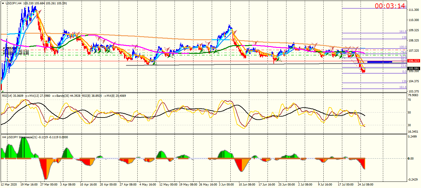 H1 shows a remarkable divergence ,,, so I expect price has a correction to 106.30-106.10 ,, which is 50% fibo level , old support line now changes to resistance area ,, and SMA 21 ,,macd & rsi wrote: Thu Jul 23, 2020 2:16 pm #USD/JPY :
