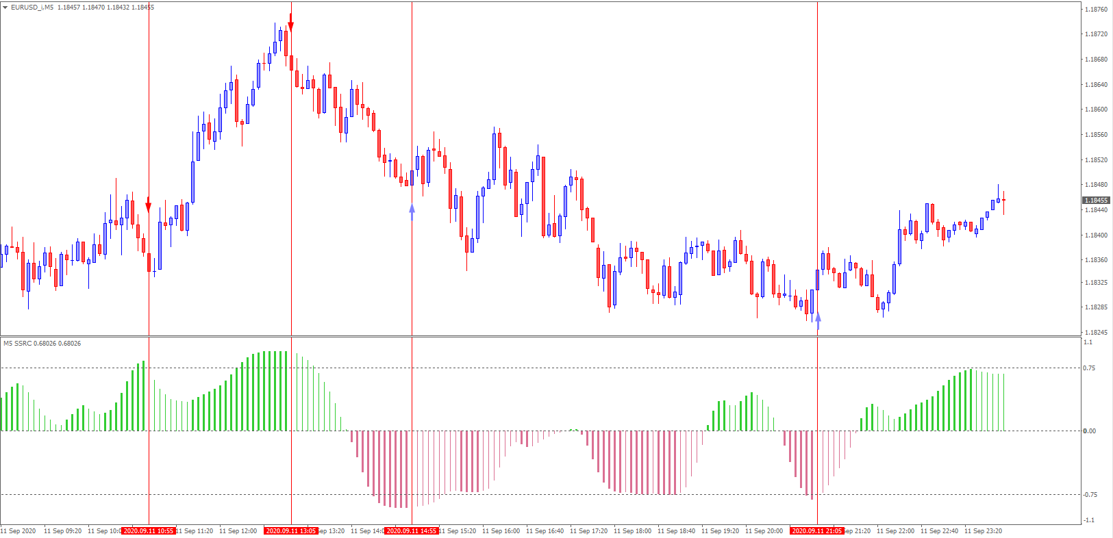 As I showed in the screenshot, the histogram should rise above the 0.75 line or fall below -0.75 or equal to it, the arrow should be placed on a change in direction. Arrows if you can make on the chart.