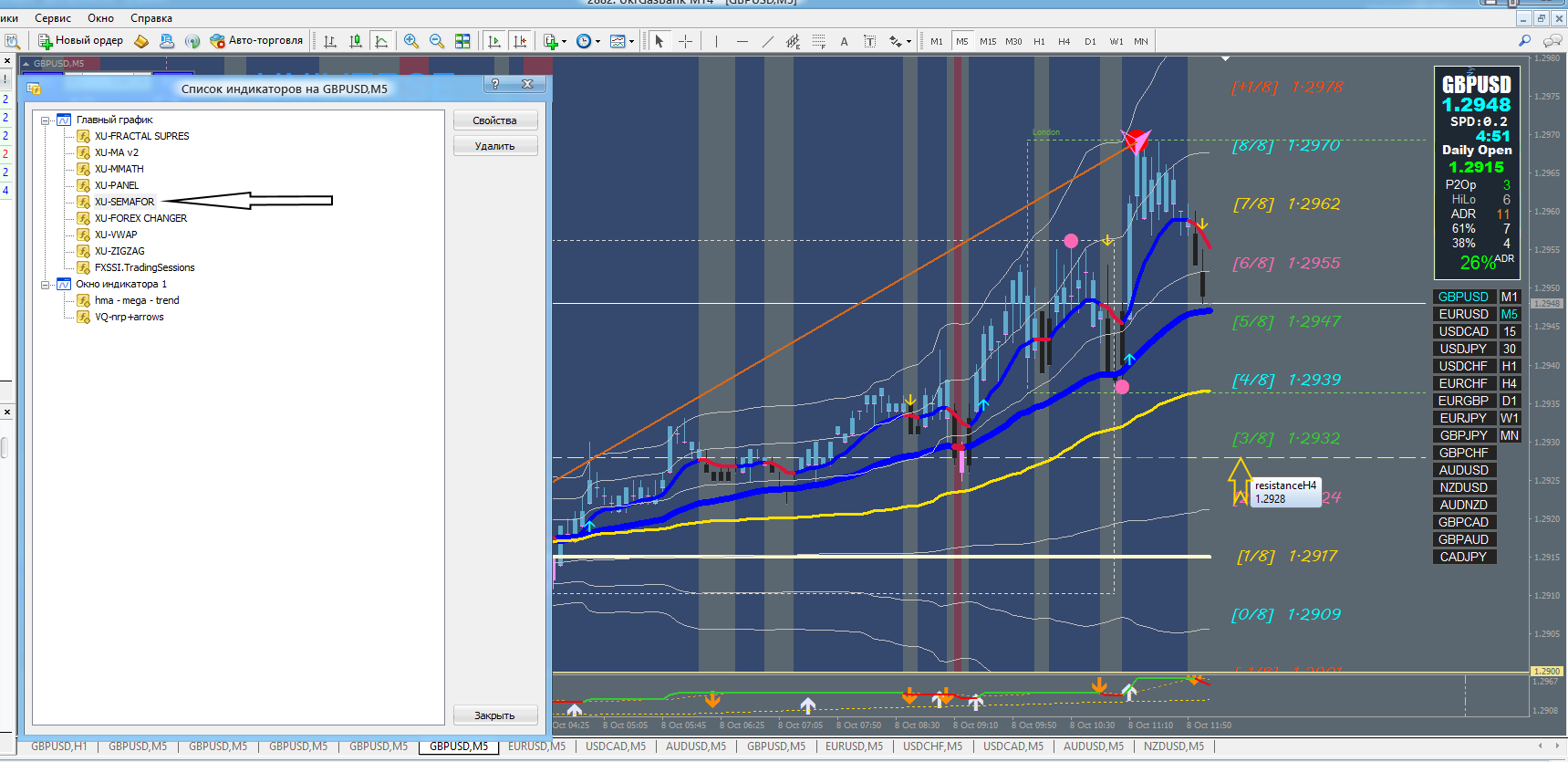 Но смотри - снизу и сверху "штриховые линии" - это сопротивление и поддержка с ТФ Н-4, цена "ходила между ними". Но тут надо учесть время торговых сессий.