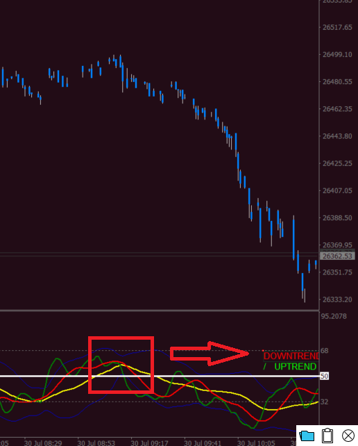 ## ignore the yellow line as its mid of volatility band ( which is also known as market base line ) , i only need to know whether RSI Price+ Signal line cross above/below 50 level of RSI as they move faster, hence giving me time to prepare if my trades change direction.