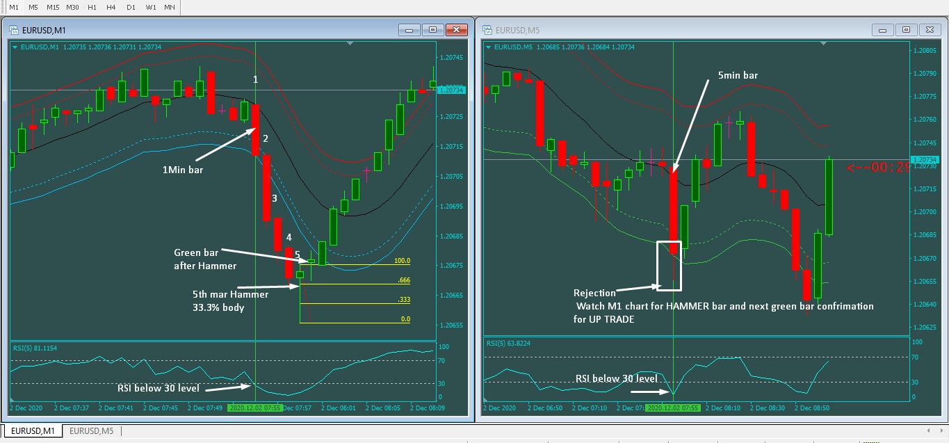 when M5 bar breaks outer channel bottom ;RSI line breaks 30 level and the same time needs to watch M1 chart for 5bars;