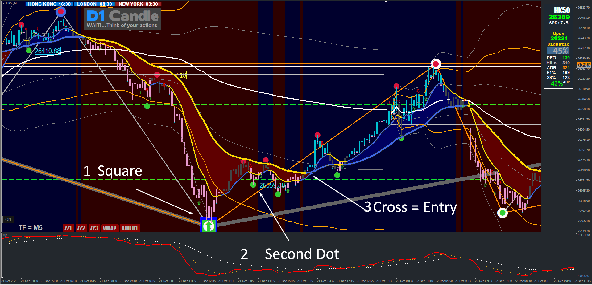 Basically, we trade the turning points Square to Square, this could be the 4hr, 1hr or 5m chart. Once a Square appears we tend to wait for a 2nd Dot to appear. We use the 2nd Dot to confirm that the current Square is set and less chance of it repainting. Now we can start to trade in the direction of the next Square using the 2nd Dot as our starting point and trading when price crosses our Trend line.
