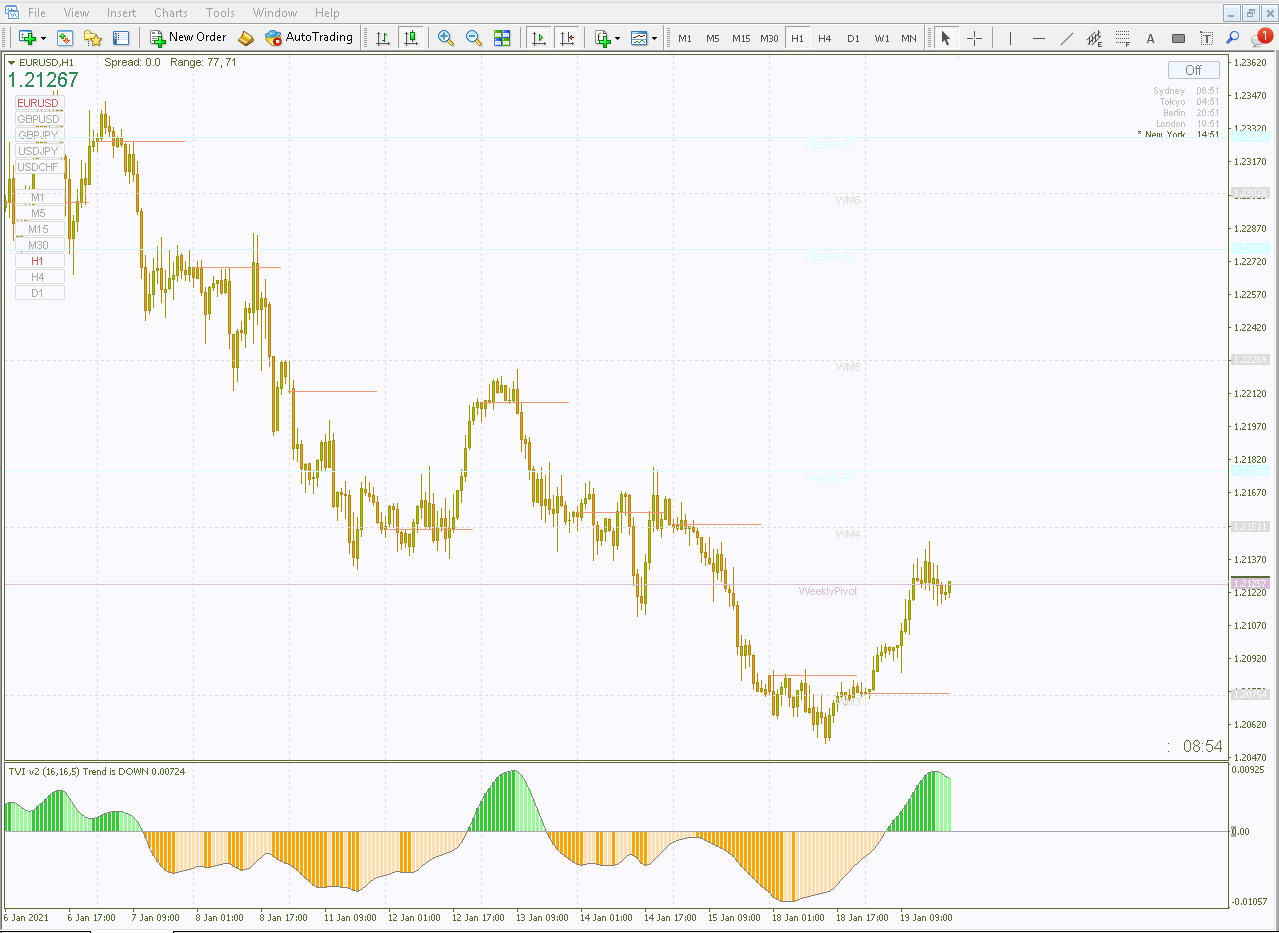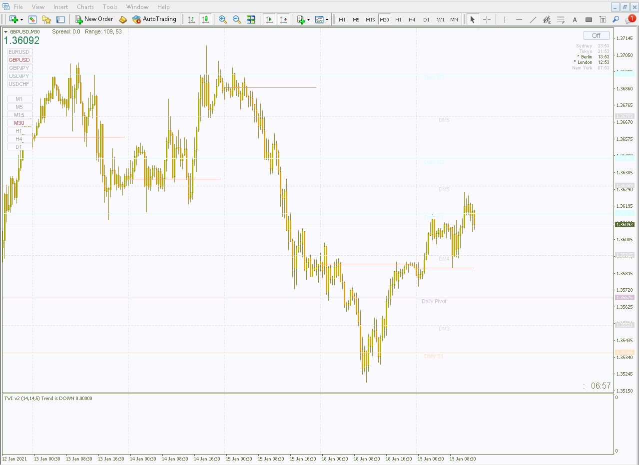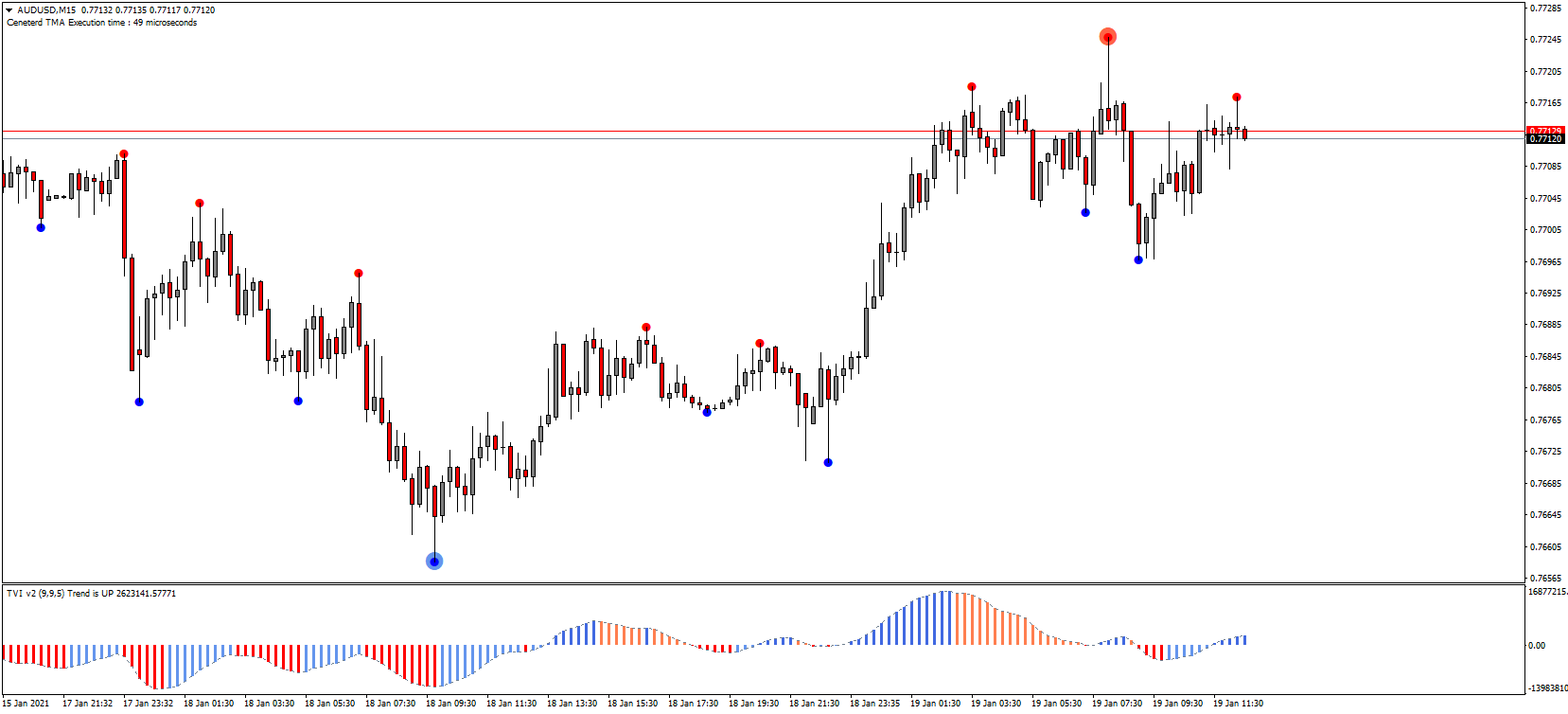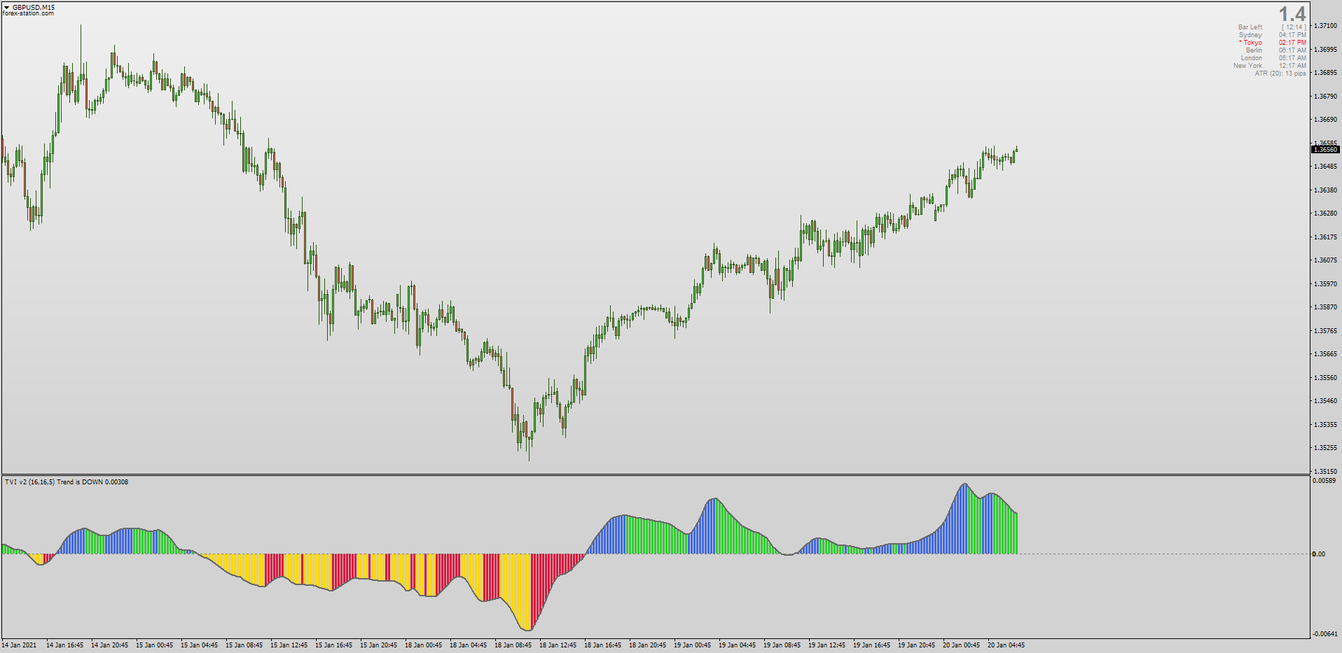 - TVI bar color change is a signal to enter the market. When the TVI changes from yellow to red, it is a signal to buy and if the TVI bar changes from blue to green, it is a signal to sell.