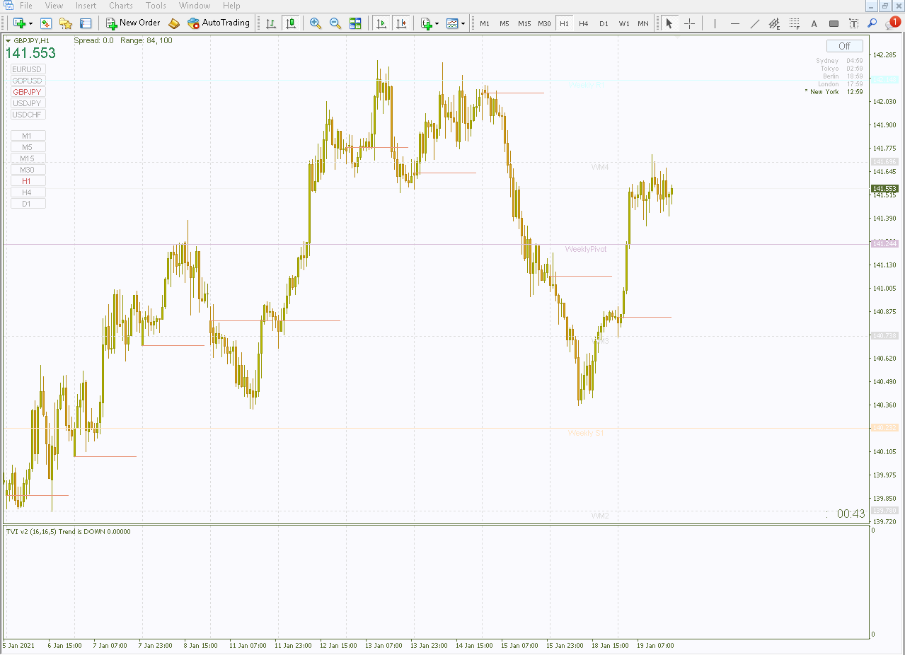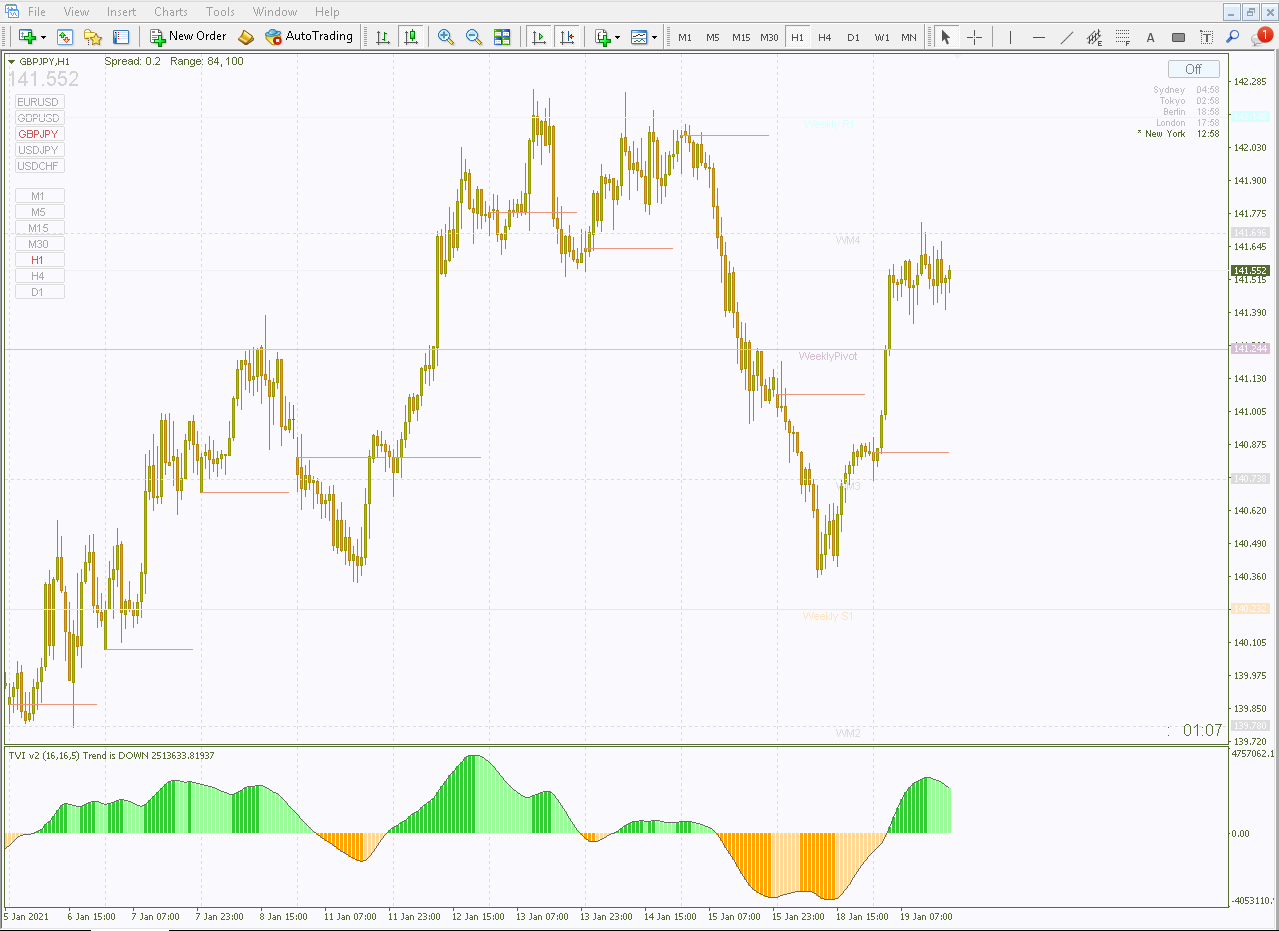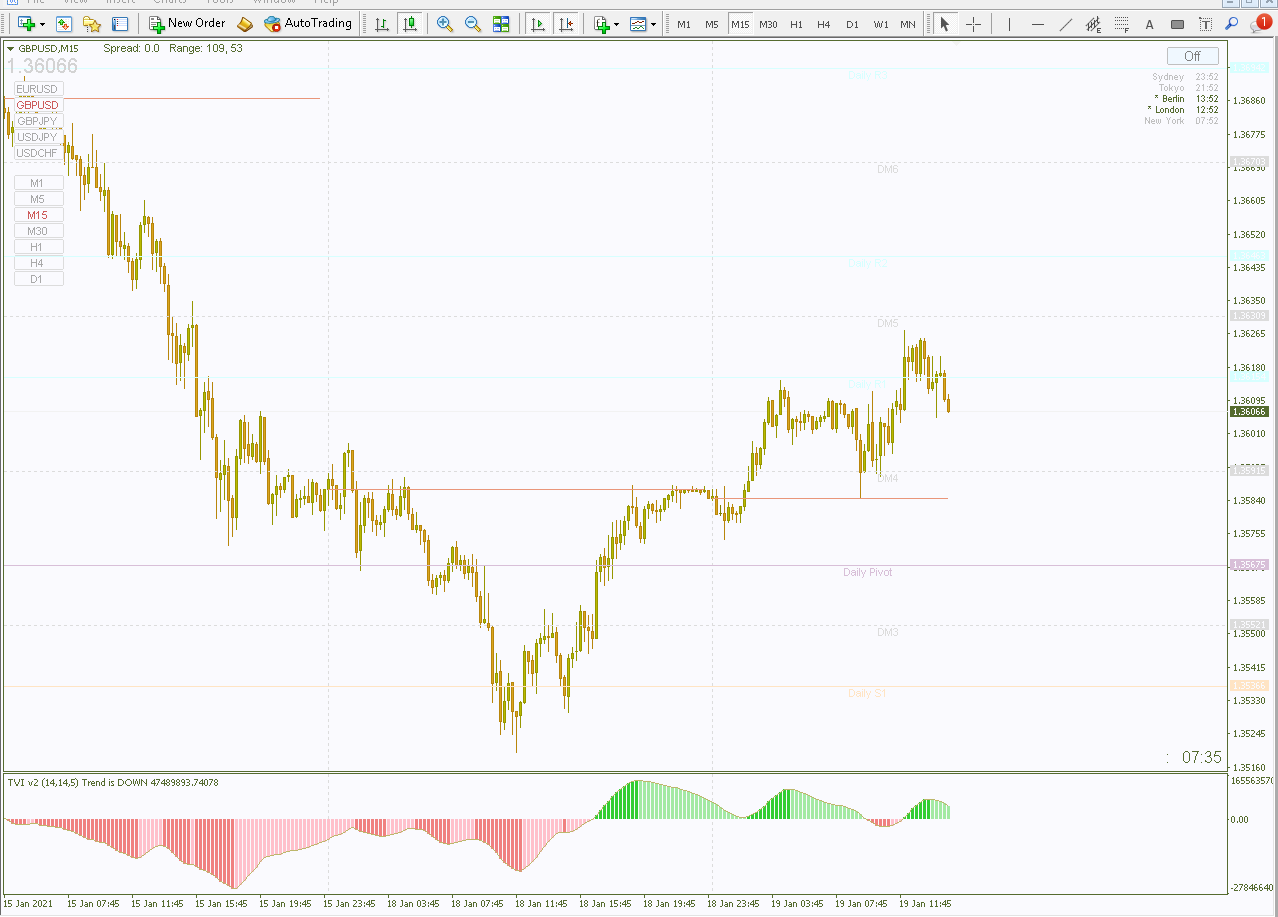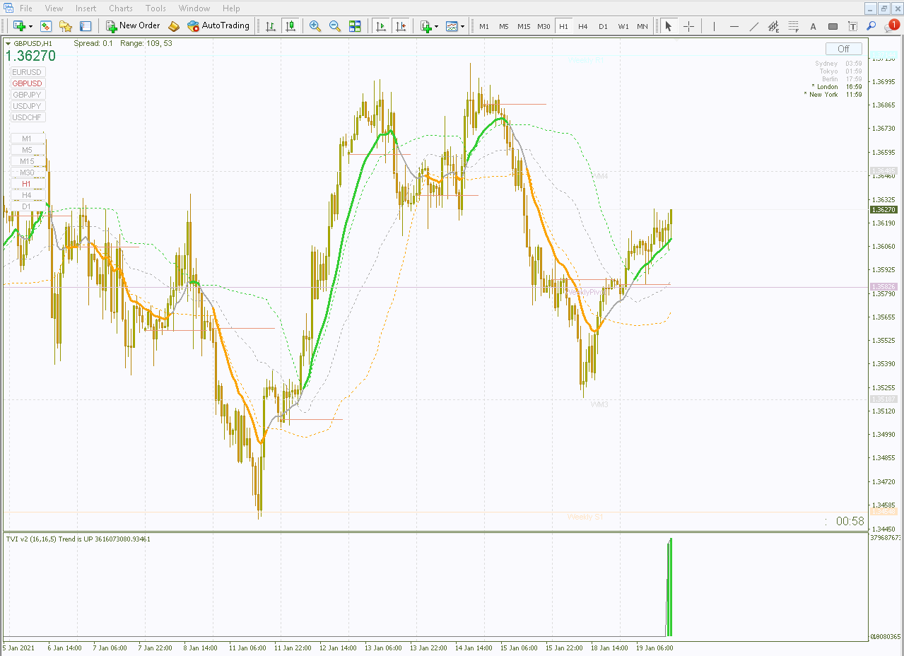 - TVI bar color change is a signal to enter the market. When the TVI changes from yellow to red, it is a signal to buy and if the TVI bar changes from blue to green, it is a signal to sell.