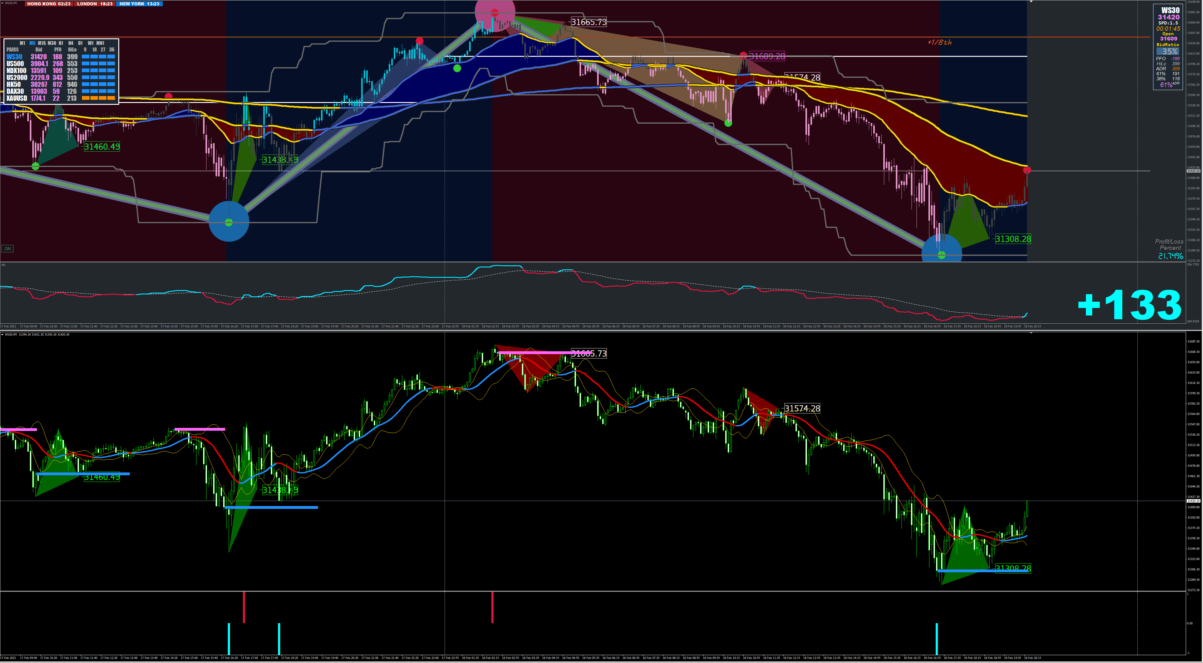 In the enclosed screenshot you will see the 5m chart and the 30m chart showing 15m & 1hr Dots, Triangles (with Dots), ZZline, and backgrounds. You also have the 5m & 30m Triangles (no Dots attached to them but still ideal to enter trades from).