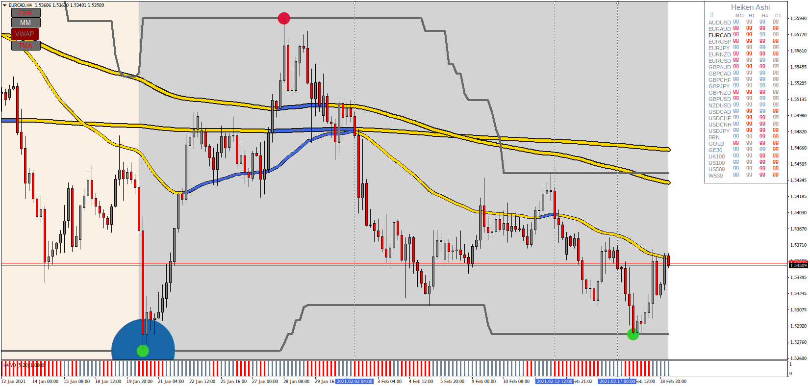 Apart from that it looks real clever and (only on the surface) beguilingly simple (Your EMAs and semaphores seem to change period entries as you change TFs - maybe you care to explain, so that we can understand what is happening).
