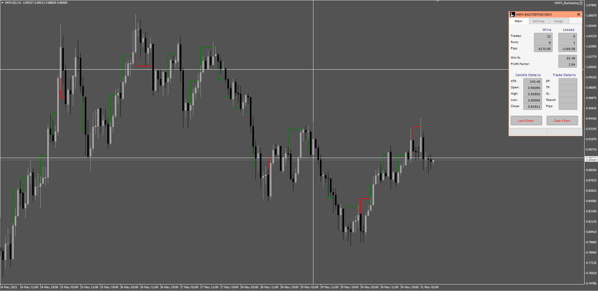 The EA will keep track of total trades, total wins, win %, profit % and allows the user to export the backtesting data as a *.csv file.