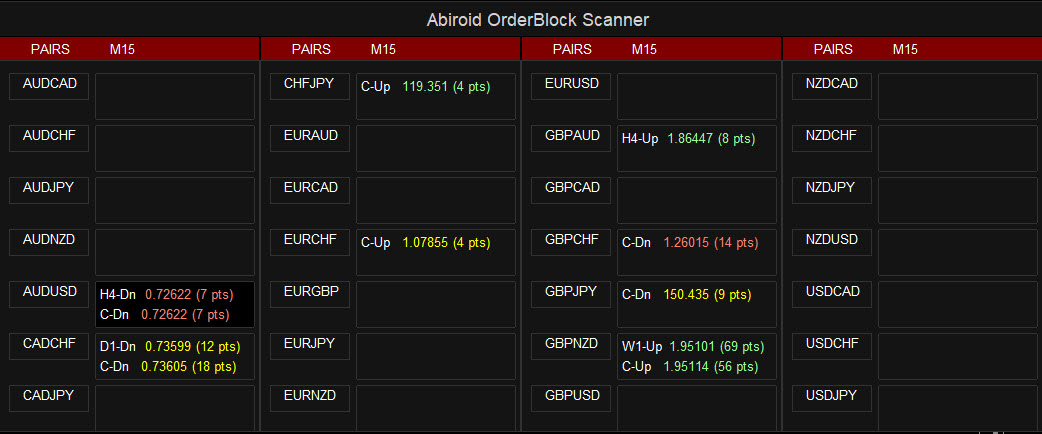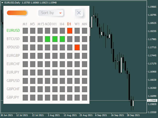 An indicator that scans multiple symbols and timeframes and displays result in a graphical panel.