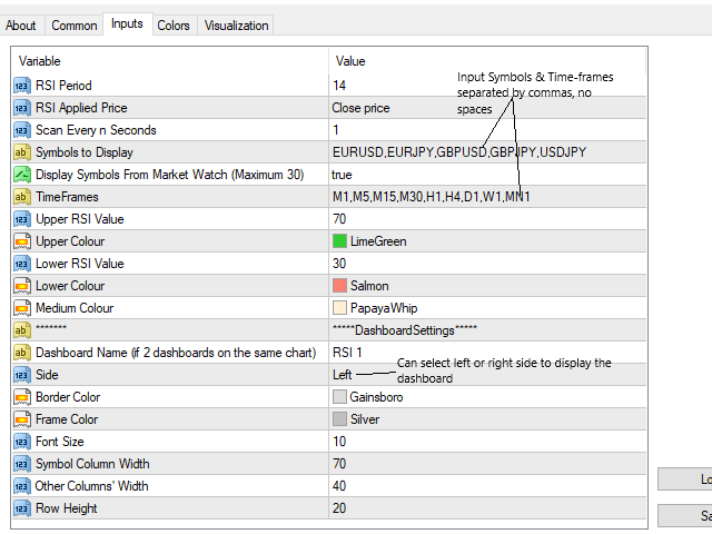 - You can input upper and lower RSI values and the colours can be set to show when above/below these values.