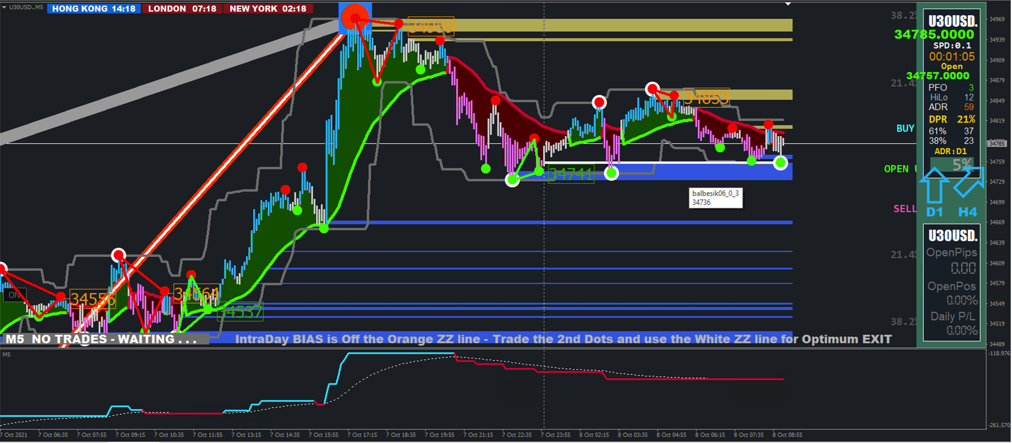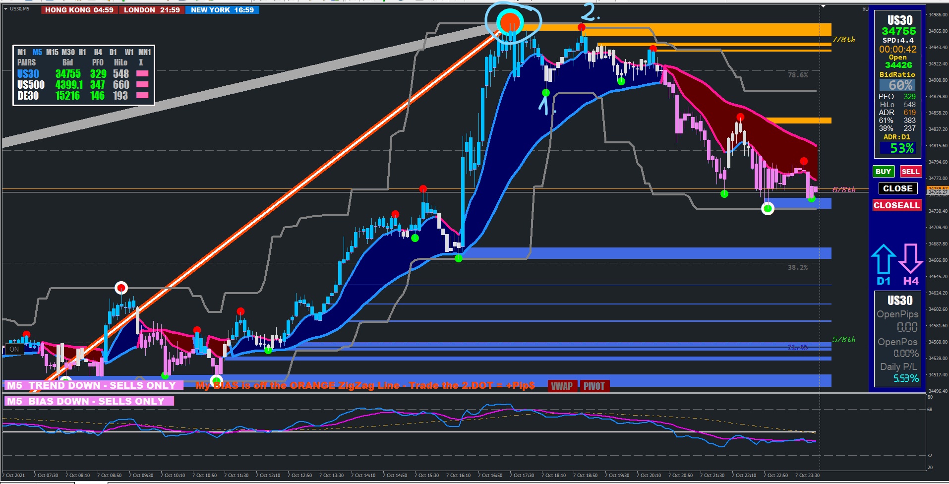 I'm checking the h4 chart. For example on the US30 I see thatthe bias is down white little dot. Then I coming down to h1 and m15. On the m15 I see that the bias is down because of the perimeter dot and away from the orange line. So I go down to 5m to enter trade. down.