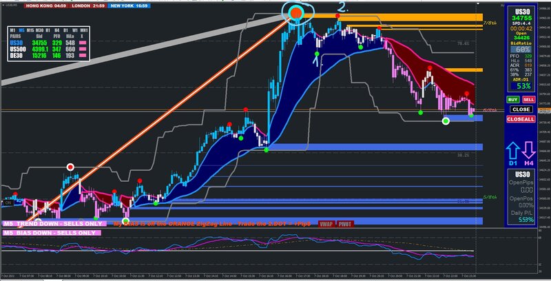 Xard might correct me here but I think you would continue trading in direction B selling off the yellow Dots and taking short scalps. I would be careful though if there is a larger retracement to the yellow Dot and be ready for a higher Blue Dot indicating a likely trend change.FourXXXX wrote: Wed Oct 06, 2021 5:49 pm Away from the Orange Zig Zag so A. viewtopic.php?p=1295446661#p1295446661