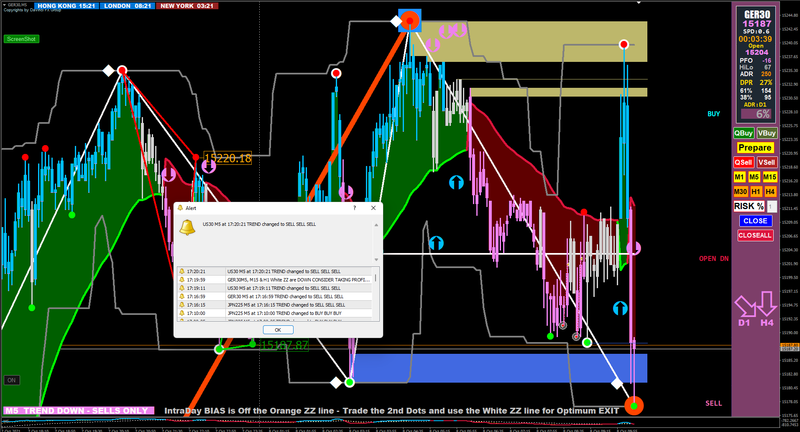 I'm checking the h4 chart. For example on the US30 I see thatthe bias is down white little dot. Then I coming down to h1 and m15. On the m15 I see that the bias is down because of the perimeter dot and away from the orange line. So I go down to 5m to enter trade. down.
