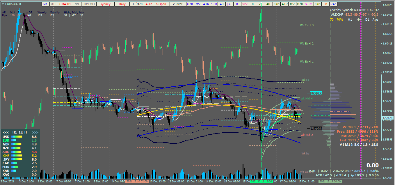 The statistical z-score value is getting injected inside an algorithm or as an option to be part of an equation for predicting trend-end probability. The vertical line guides on this system (from & to) are used for plotting from price inflection points or session range (4-hour, daily, weekly, and monthly or 8-hour or 24-hour market range). The setup included a feature that can switch from MVWAP (MA-based VWAP ) to classic VWAP. The MA (Moving Average) is a Hull MA non-lag fused using a Fulks Matulich way of calculation of a T3-based MA. As a result, I called it a T3-HMA.