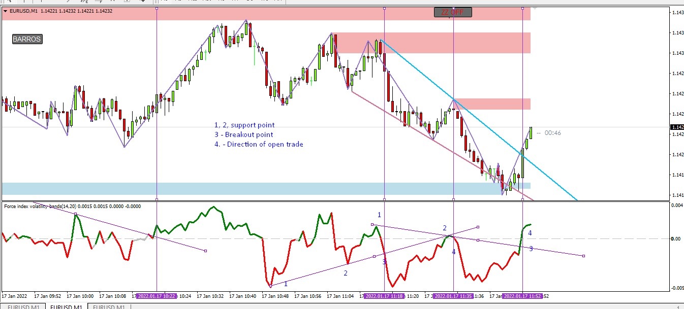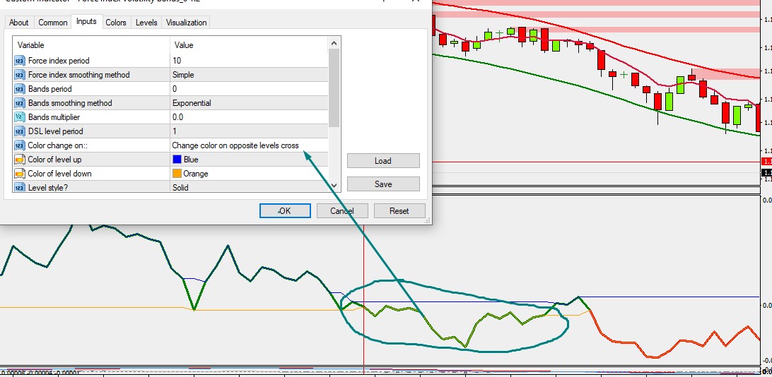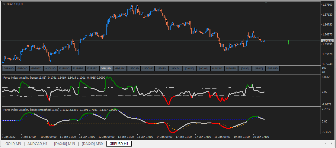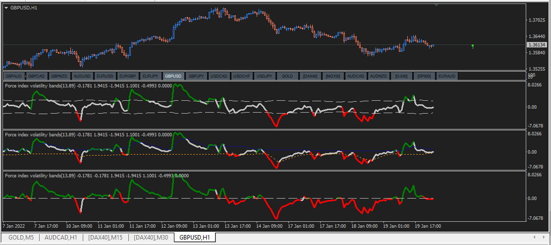 Force index is a tool that already tells the power(volume) used to move the price of an asset. In addition to that this new implementation provides bands based on volume and volatility. Breakouts from these bands is easily visible with the color change. Expansion and contraction of bands can hint rise and fall of volatility.