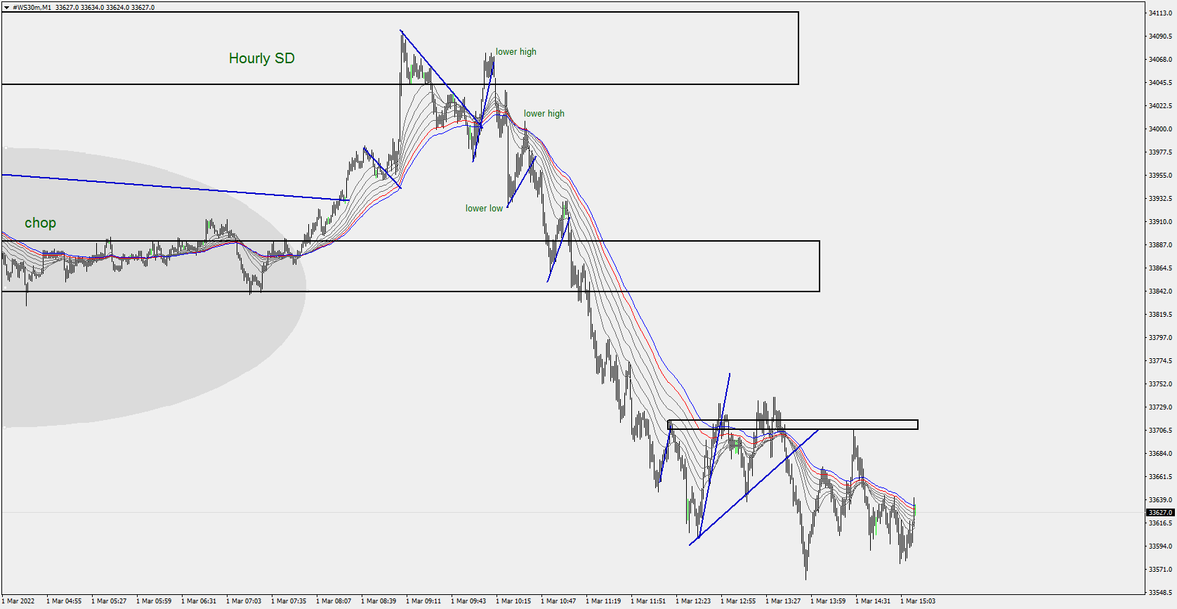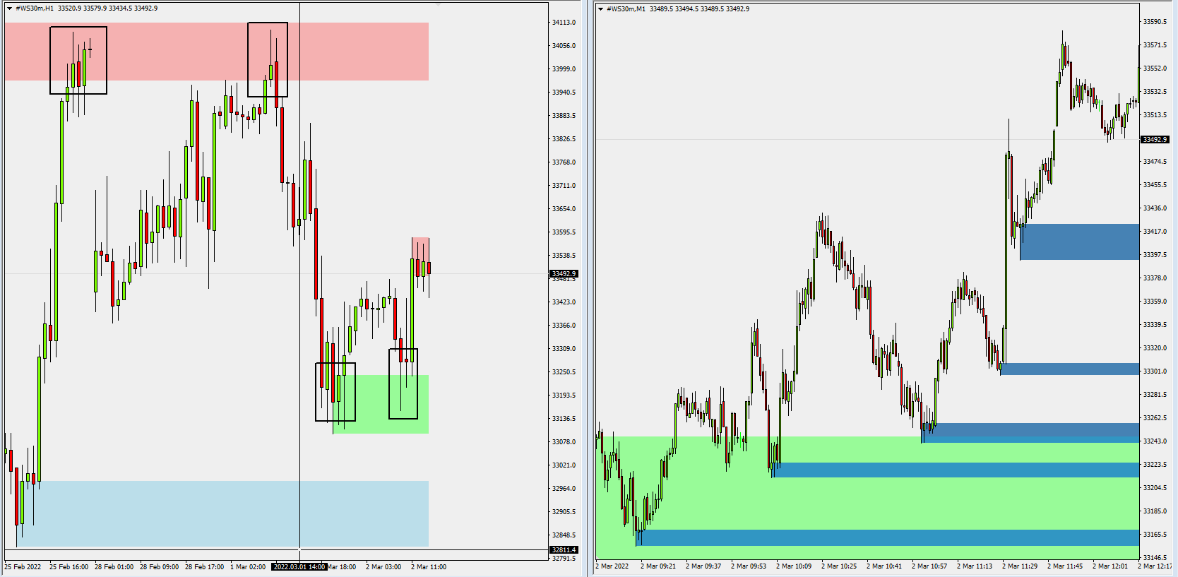 US30.....Yes, same as yesterday. Back down to the Daily SD Zone (white) and then back up again. If nothing serious happens I guess we got an established bottom for the time being.