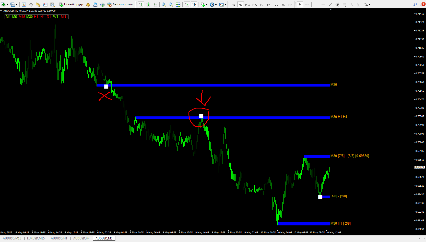 10This indicator gives signals of level retests as white squares.