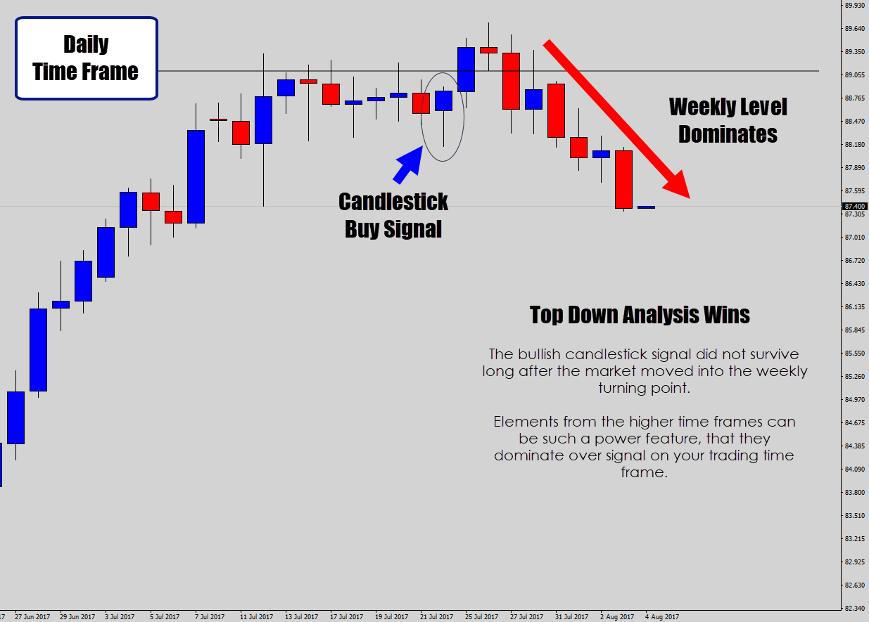 Above: A classic scenario where the higher time frame analysis overpowers the single value of a candlestick trade signal on the trading time frame.
