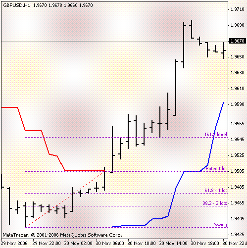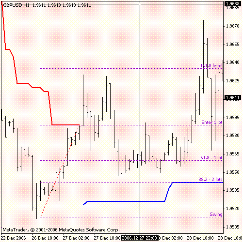 Pending order for trade 2 at the 61.8 level 1 lot, pending order for 2 contracts (trade 3 and 4 ) at the 38.2 level.