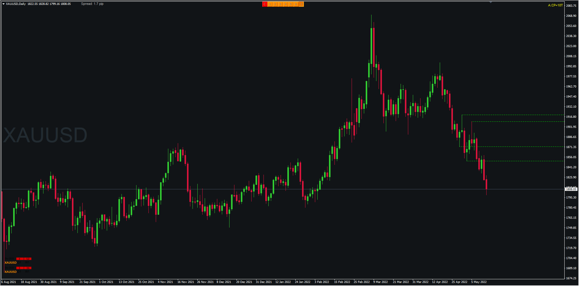 (trendlines from the candle tip extended to screen end far right)