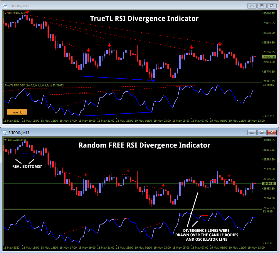 We have added a fully customizable show / hide button to our all divergence indicators. Up until recently you could only show / hide / recalculate the divergences with "[TrueTL] Calculate" and "[TrueTL] Hide" scripts, but from now on you can also do this with the show/hide button. Similarly to scripts, the recalculate function is also available for the button: if you scroll back the chart (auto-scroll must be disabled in MT4/MT5) and press the show button, the indicator will draw past divergences from the last 300 candles until the last visible candle.