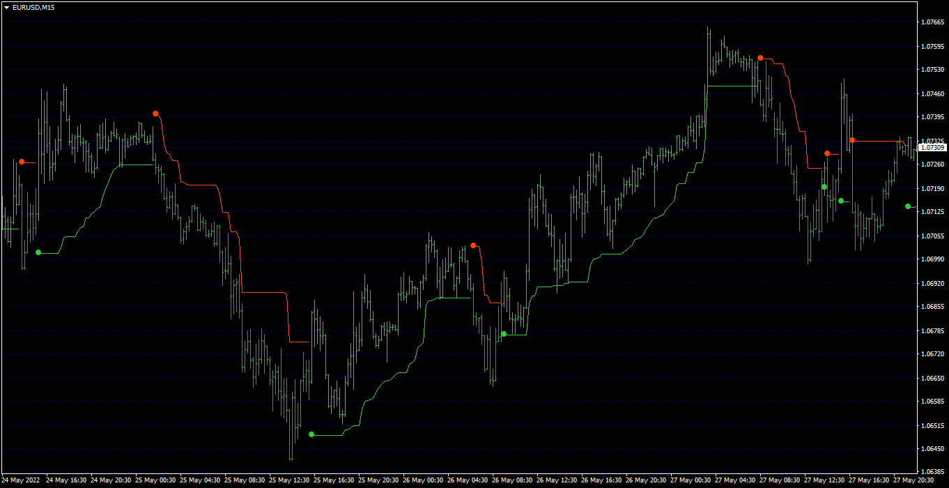 plotshape(buySignal ? longStop : na, title="Long Stop Start", location=location.absolute, style=shape.circle, size=size.tiny, color=longColor, transp=0)