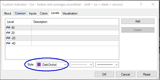 No bug, your colors are in your external parameterswilson wrote: Mon Jun 13, 2022 2:11 am Hello Mr. Tools , thank you for the !!rsi - heiken ashi averages smoothed - (mtf + sw + alerts + arrows).ex4 fantastic indicator. I would like to report some bugs on this indicator. Whenever I try to change the colors tab, you can't save the color and the line size in the settings. It will not change even after you loaded from a save settings. Also the levels tab color setting is contradicting with the color settings under the input tab (last 2 settings at the bottom).