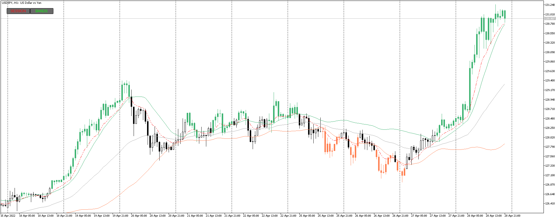 red, the Bollinger bands are outside the Keltner channel, which suggests that exchange rate is trending strongly.