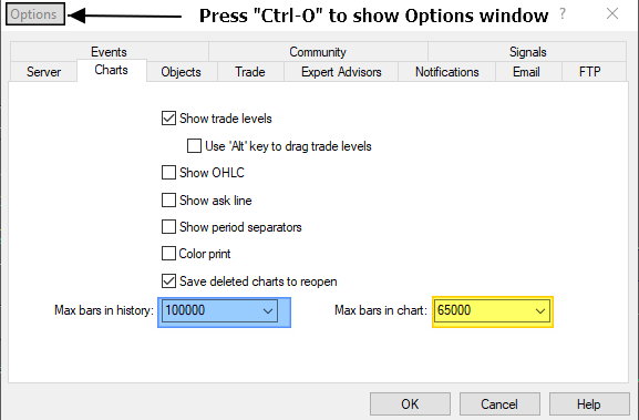 D) ...And finally, change the parameter value of the MT4 platform by going to the Options window (Max bars in history)