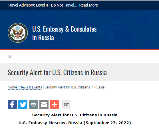 Ogee wrote: Wed Sep 28, 2022 10:01 pm The US Embassy urges US citizens to leave Russia immediately. Earlier, Poland and Bulgaria urged their citizens to leave Russia.
