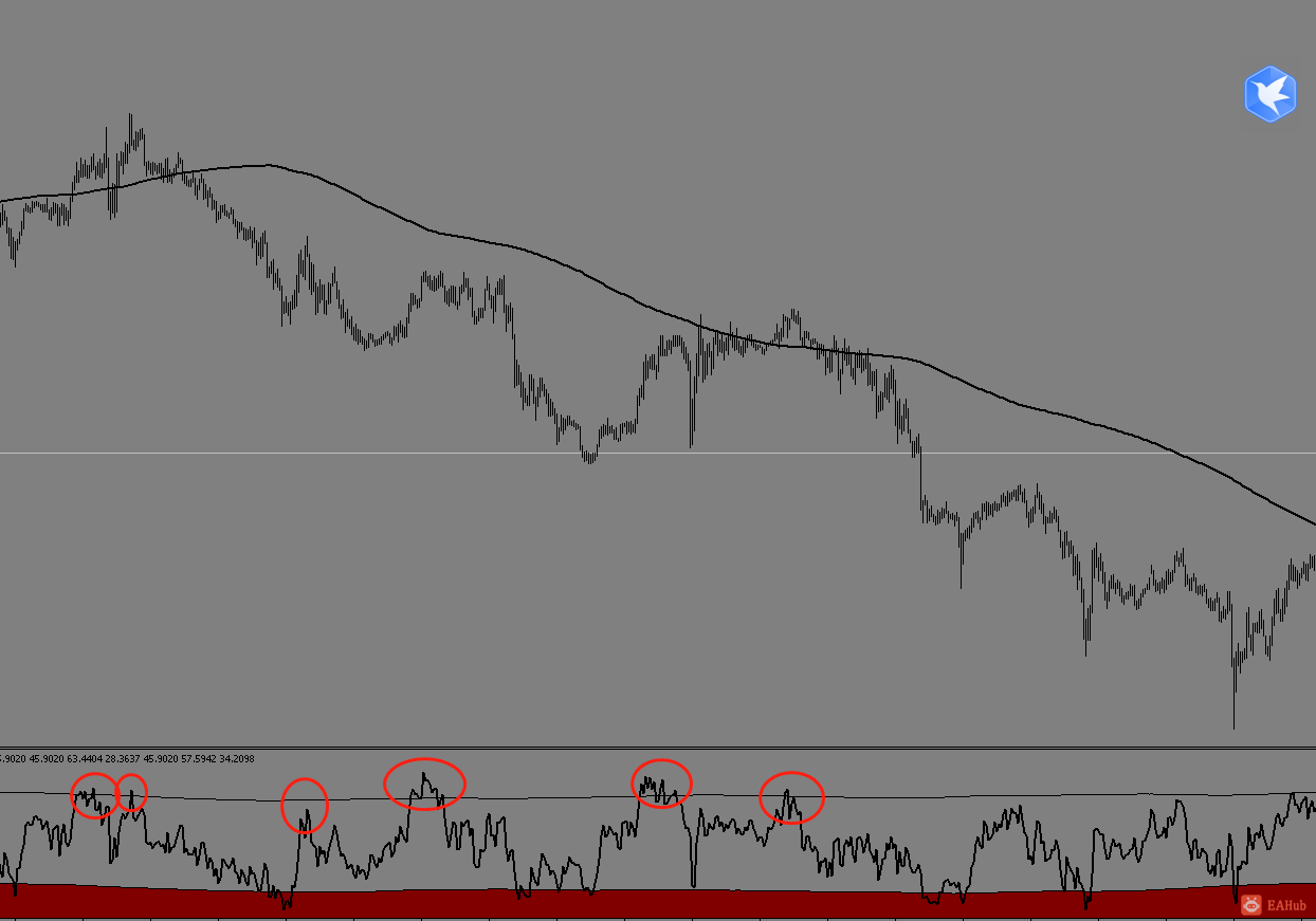 The long signal is as shown in the figure below. When the green square is in the trend of long, wait for the smooth RSI to reach the black line below to do long, the red circle area, and use the moving average to filter the signal.