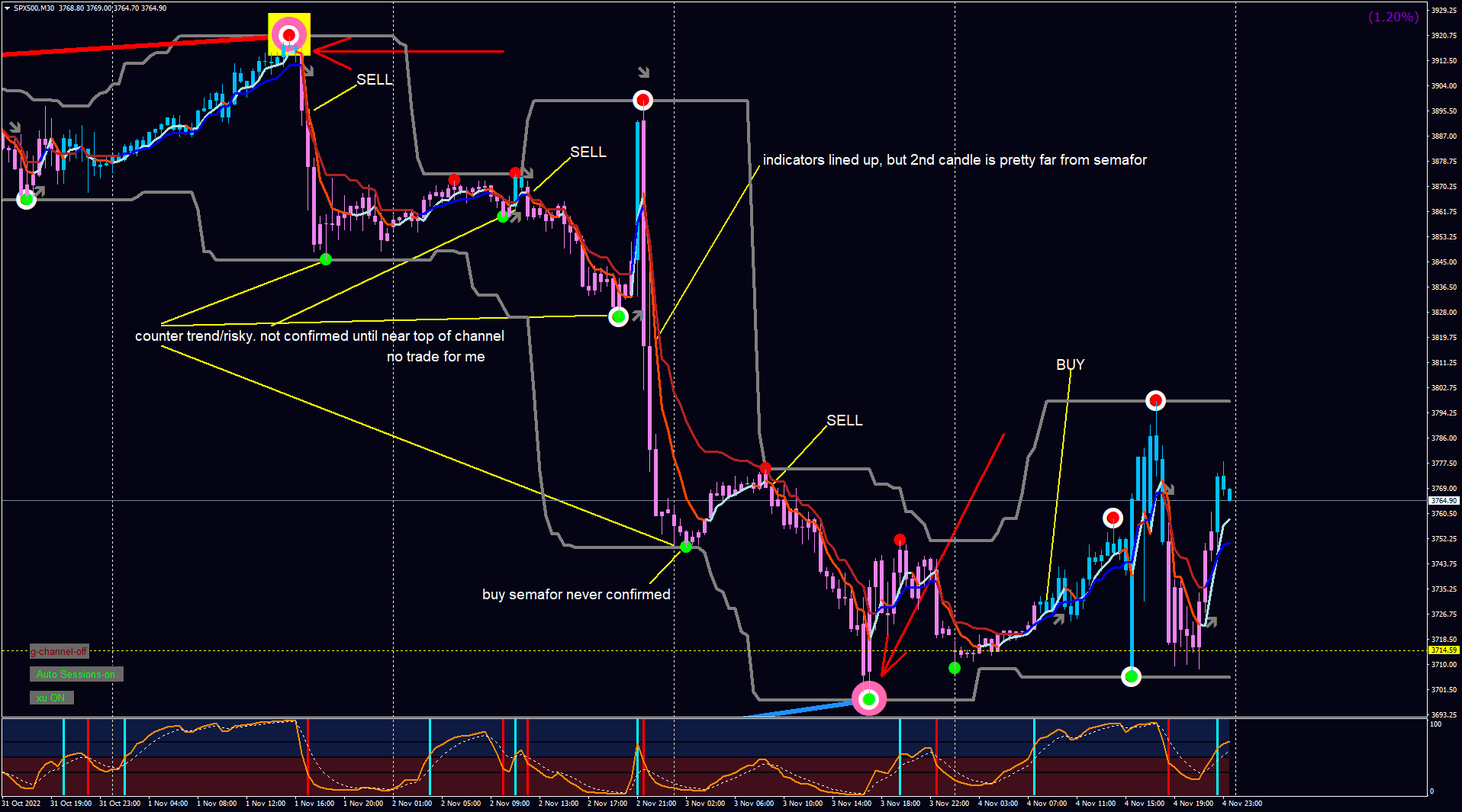 For me, I prioritize the 3 g-channels lining up with the bias (big semafor) and the rsi ahead of the channel. It feels like the channels are an indicator that has more room for an artistic interpretation when thrown into the mix…how far away from the channel is your semafor?…beyond the halfway point? How close to the opposing channel did your candles change color?…