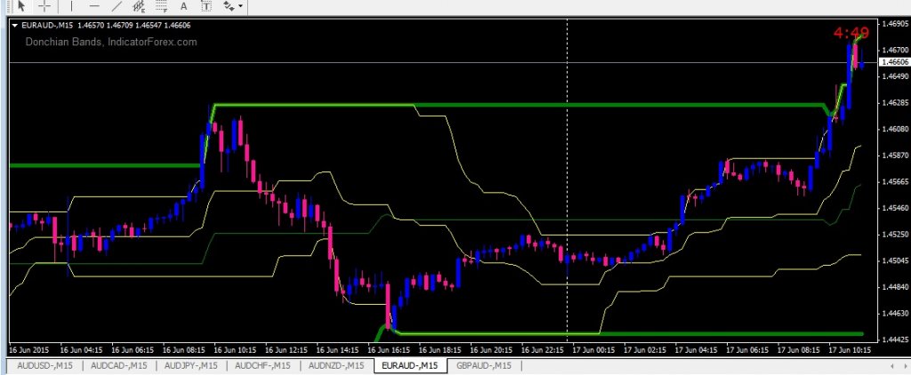 Buy when the price breaks above the upper donchian band period 96 (green).