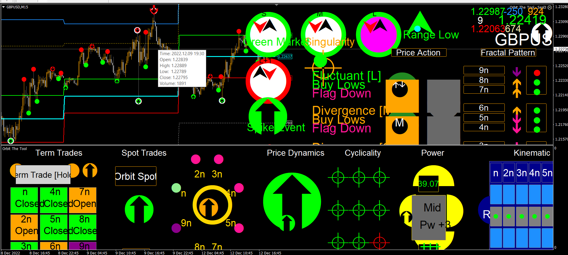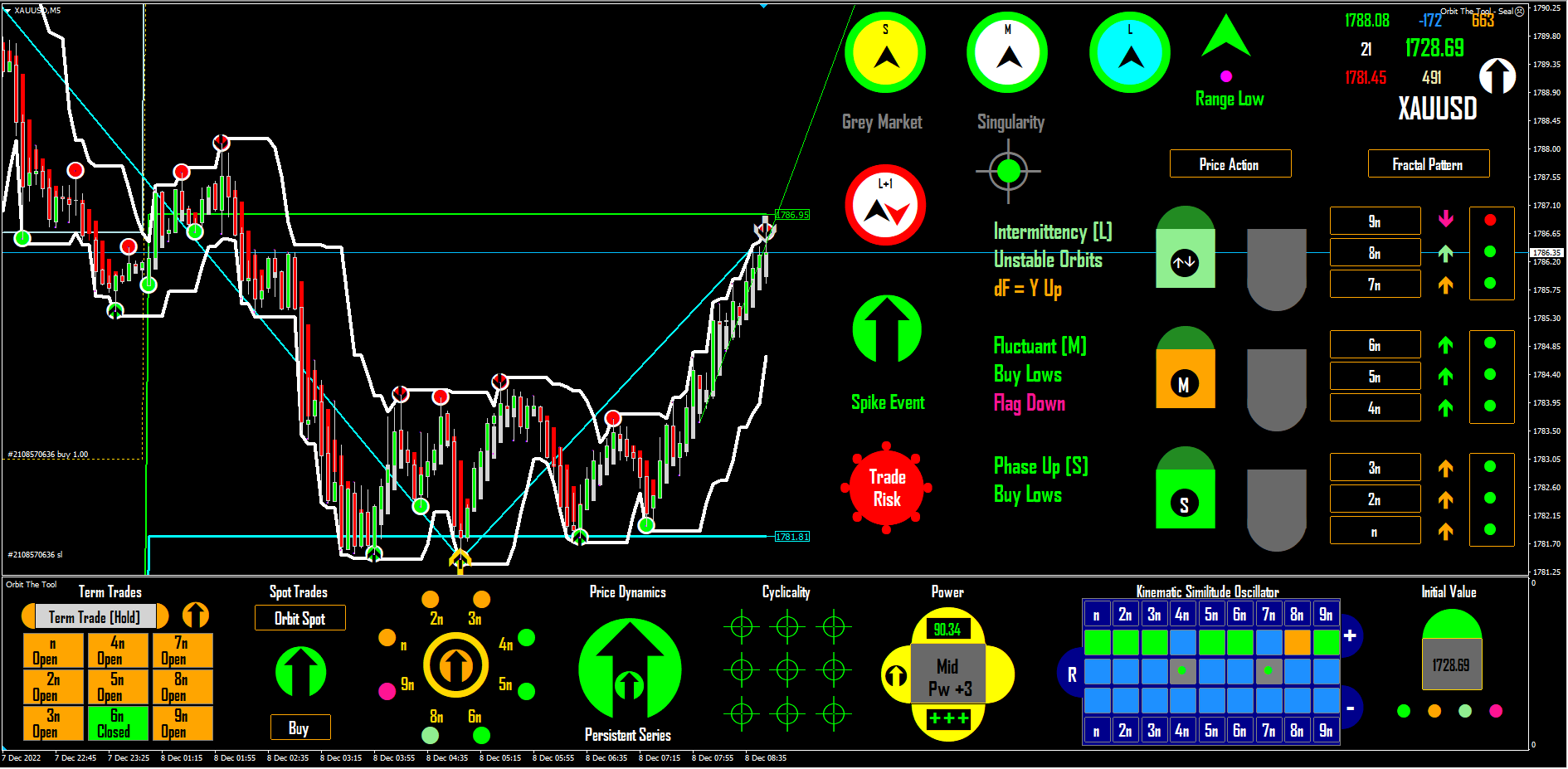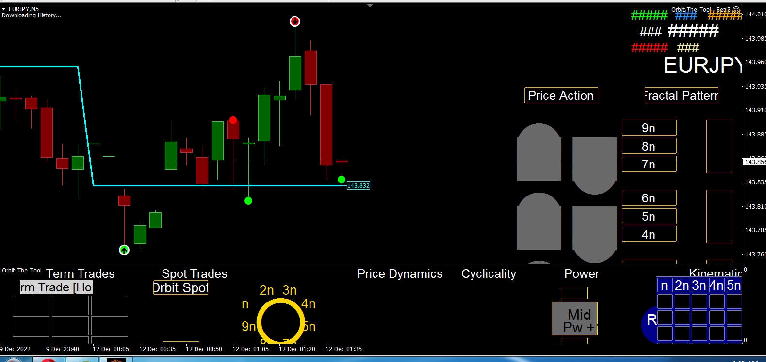 This is not "technical" analysis this is deterministic chaos and therefore precise. So try to first understand the implications of the equation to a level that is intuitive of the actions you observe as the market fluctuates, then you are more likely to read the implications of the output of the same behaviour as the tool provides. There is no other way out. The market is real and its behaviour is constant as well as consistent with what the equation describes (and hence the tool is never wrong by definition). Do not rush to trade the tool by ignoring the meanings and full implication of the behaviours the equation describes. The equation is graphical mathematics and really it is visual so extremely simple to intuit. Please read again the equation in "How to trade and set stops in Orbit" and also revisit the algorithms - just because these things in those write up appear simple does not mean you should not first intuit them very well - the market is dynamical and therefore, you must imagine and visualize what you read in terms of how you know the market to behave from the equation which is ALWAYS correct.