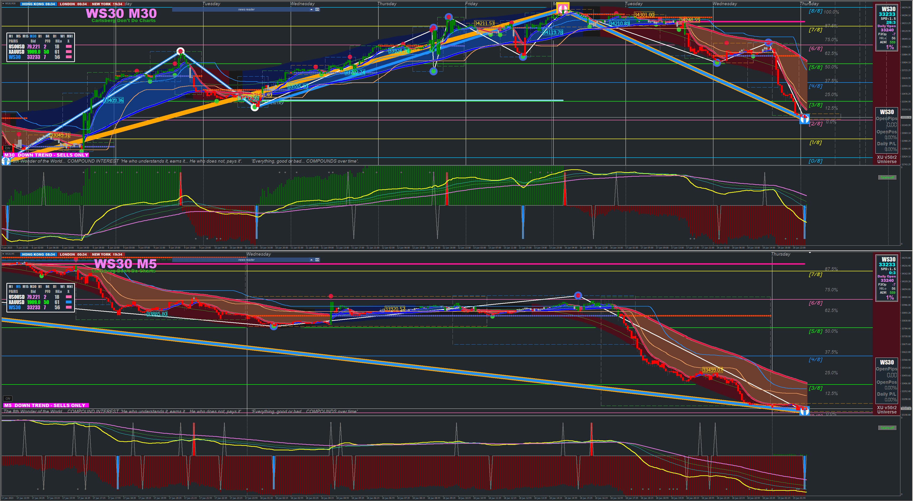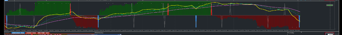 XARD: Look at exiting your trade if you have hit a fixed amount of PIp$ (say +100Pip$$$ on the Dow Index), or look at exiting the next Blue Zigzag. You can scalp and just exit when the semafor dots appear and look at scalping off the next dot.