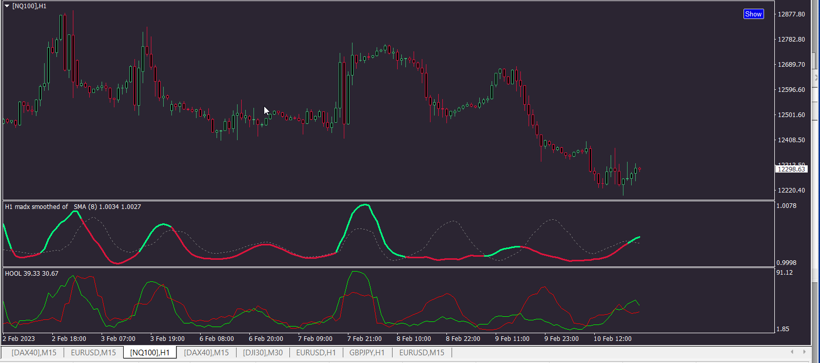 The whole point of calculating through open is the desire to avoid blinking the indicator on the current bar. I also tried to change the ADX calculation by dividing the highlow through the open as well. This gave some improvements and the indicator began to dance less on the current bar, but the signal could still disappear when the price on one bar went very sharply in both directions, first in one,