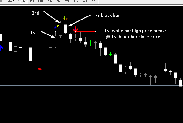 2 white bar + 1 back bar ; 1st white bar high price breaks @ 1st black bar close price