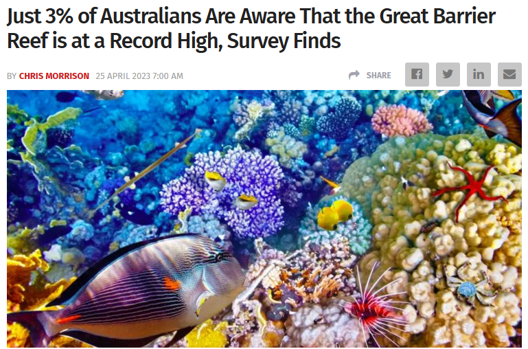 'Only 3% of Australians know that the Great Barrier Reef is at a record high following two years of record growth, a survey has found – a reflection of how well the media and scientists keep the truth hidden.'