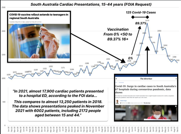 South Australia normally sees around 1,300 cardiac presentations per month for 15-44 year olds. This rose sharply in August 2021 with vaccine rollout, peaking at 2,172 in December. The whole state had seen only 1000 covid cases by 15th December.