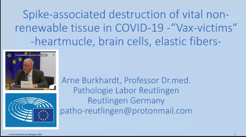 Important presentation by pathologist Prof. Dr. Arne Burkhardt (Germany) (3 May 2023) in the EU Parliament at the International COVID Summit III on his discoveries in 75 autopsies of people who died in connection with COVID-19 vaccination.