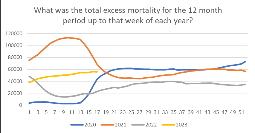 I have calculated the total excess mortality for the preceding year each week from Jan 2020. This is based on the ONS baseline. 2023 might overtake 2020, 2021, and 2022 at week 19 if this trend continues.