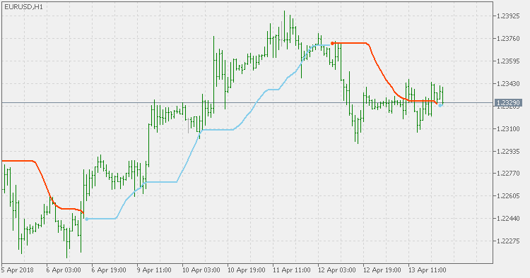 Apart from direction of the trend, the stops levels are based on the value of the smoother momentum. The distance of the stop from the used average is calculated based on the value of the smoother momentum giving the stops more room when the market is very volatile and narrowing the stops in the ranging periods.