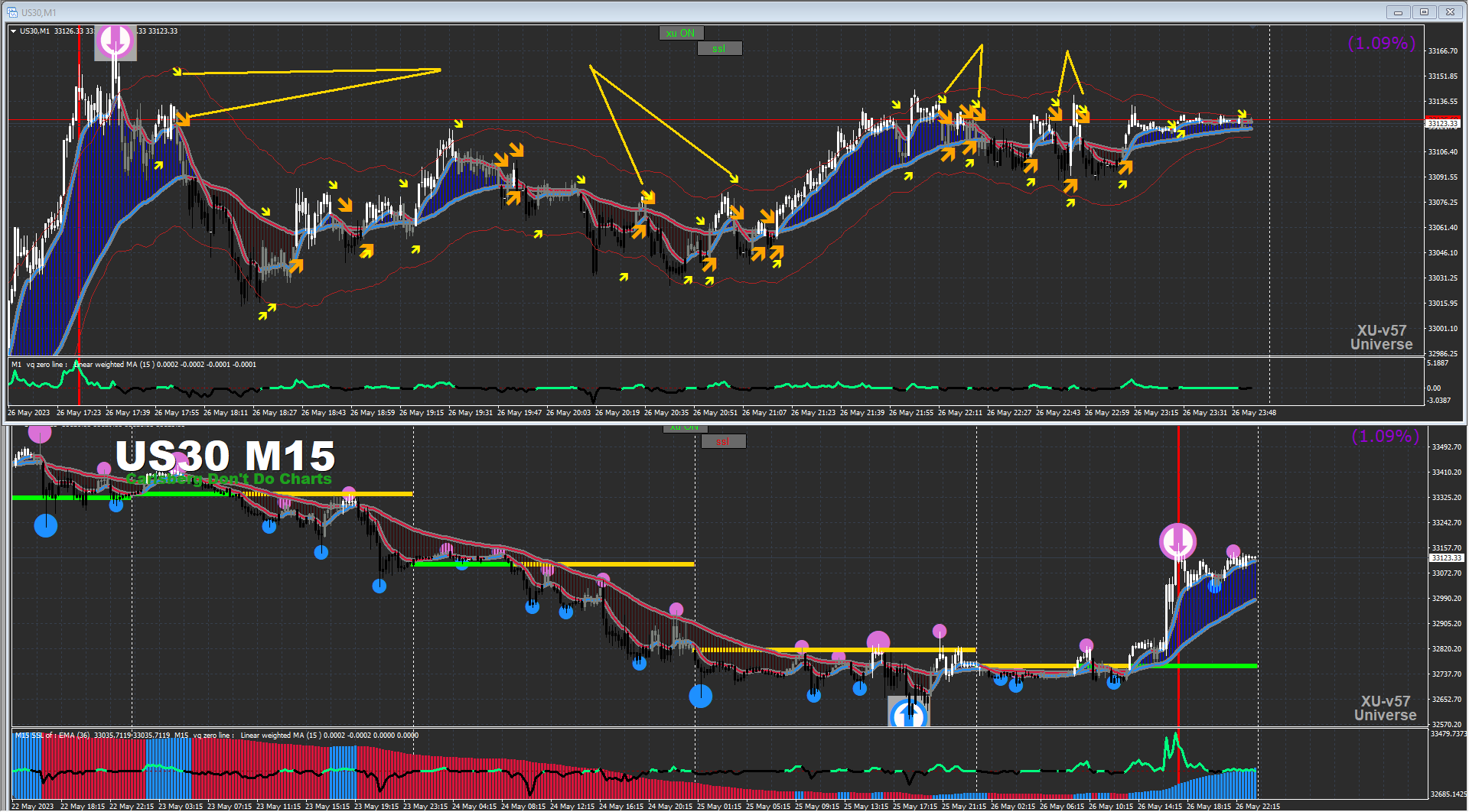 The M15/M1 combo is worth testing and trying out some different add-ons in demo. In a scalp or pullback mentality, trade in the direction of all but the smallest semafors of the M15 chart, on your M1 chart. I usually switch the M1 SSL and Volatility Quality Zeroline to on chart arrows. I will look for occurrences of a M1 semafor, then shortly after both arrows over the same candle, in suite with the latest large M15 semafor.