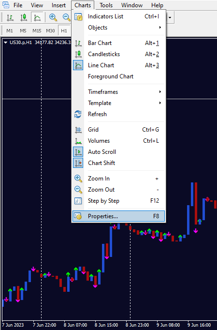 What we have to do is go to "Charts", then to "Properties" at the bottom and we select "Line Chart", which takes the standard candles off the chart.